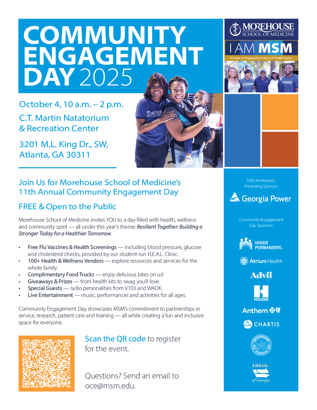 Join Morehouse School of Medicine for the 11th Annual Community Engagement Day on October 4, 10:00 AM-2:00 PM at the C.T. Martin Natatorium & Recreation Center. This free, family-friendly event will feature health screenings, food trucks, giveaways, special guests, and live entertainment, all under the theme Resilient Together: Building a Stronger Today for a Healthier Tomorrow. View Flyer.