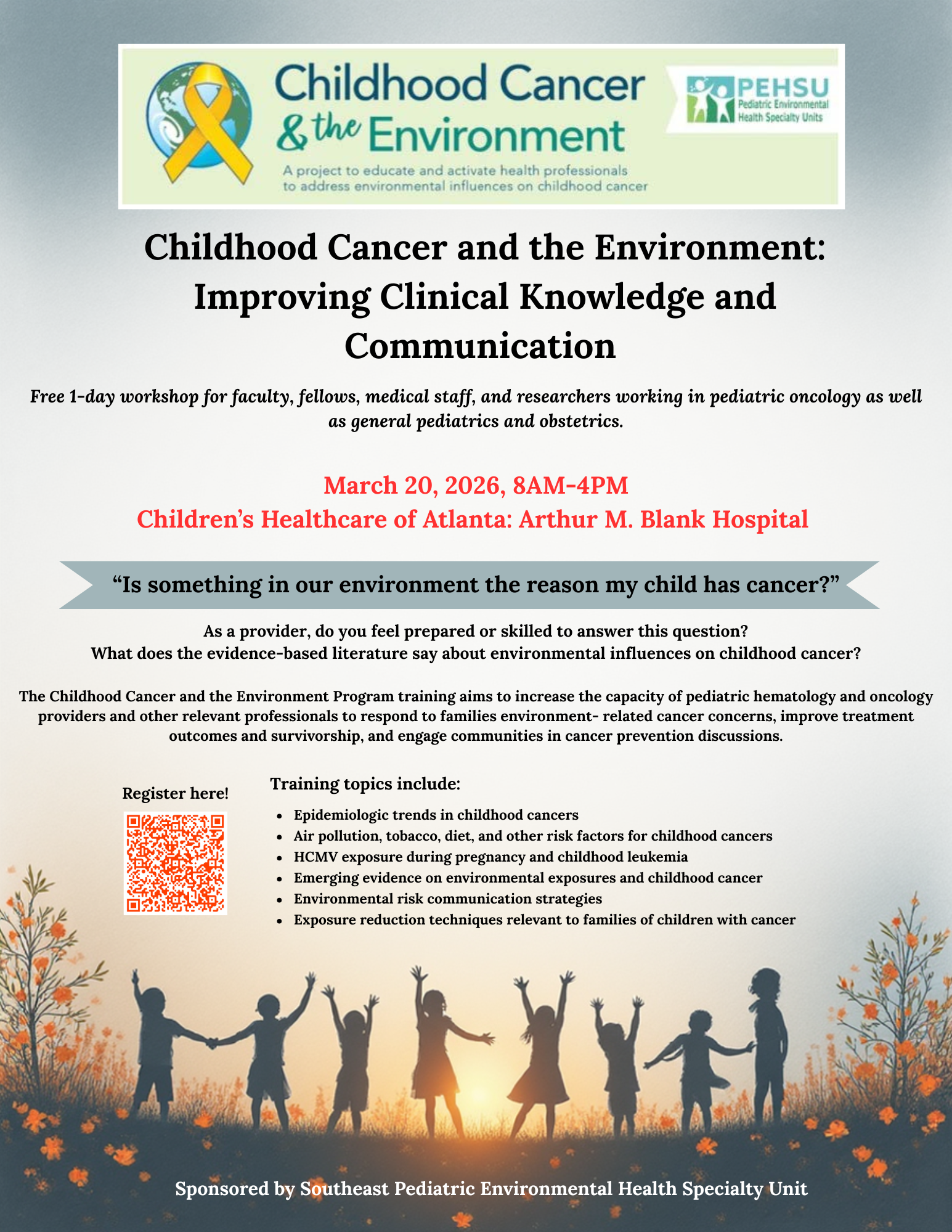 Join the Childhood Cancer and the Environment one-day workshop on March 20, from 8:00 AM - 4:00 PM at Children’s Healthcare of Atlanta, Arthur M. Blank Hospital. This free training is designed for faculty, fellows, medical staff, and researchers in pediatric oncology, pediatrics, and obstetrics, and will cover evidence-based research, environmental risk communication, and exposure reduction strategies. Registration is required to attend. Free lunch and parking are provided. View Flyer.