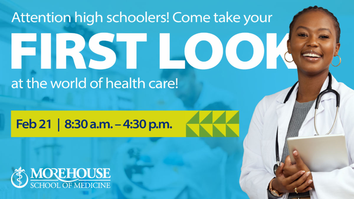 First Look Health T.E.A.M. will take place from 8:30 AM-4:30 PM at Morehouse School of Medicine. This free, in-person event invites high school students to explore careers in health care through hands-on activities, including an anatomy lab visit, clinical skills exposure, and interactions with health professionals; breakfast, lunch, and giveaways are provided. For questions, please email Aliyah Alexander. View Flyer.