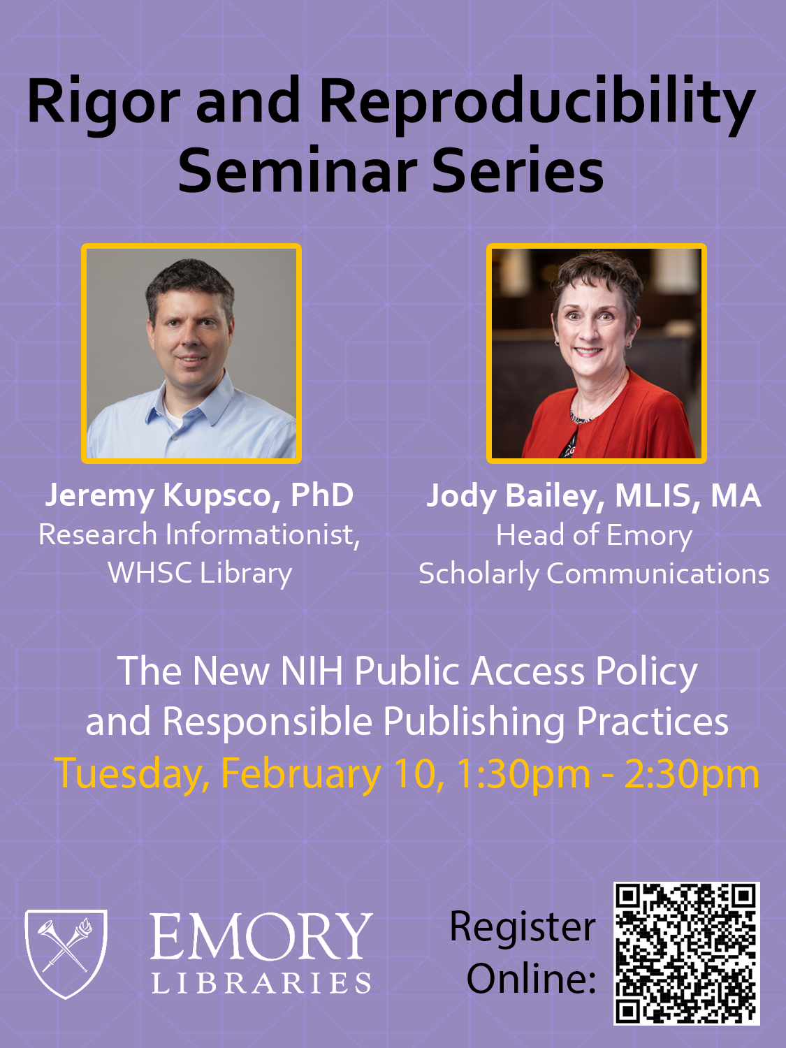 Join the Rigor and Reproducibility Seminar Series on Tuesday, February 10, from 1:30-2:30 PM, featuring Jeremy Kupsco, Research Informationist at Woodruff Health Sciences Center Library, and Jody Bailey, Head of Scholarly Communications at Emory Libraries. This session will cover the new NIH Public Access Policy and responsible publishing practices. Register online to attend. View Flyer.