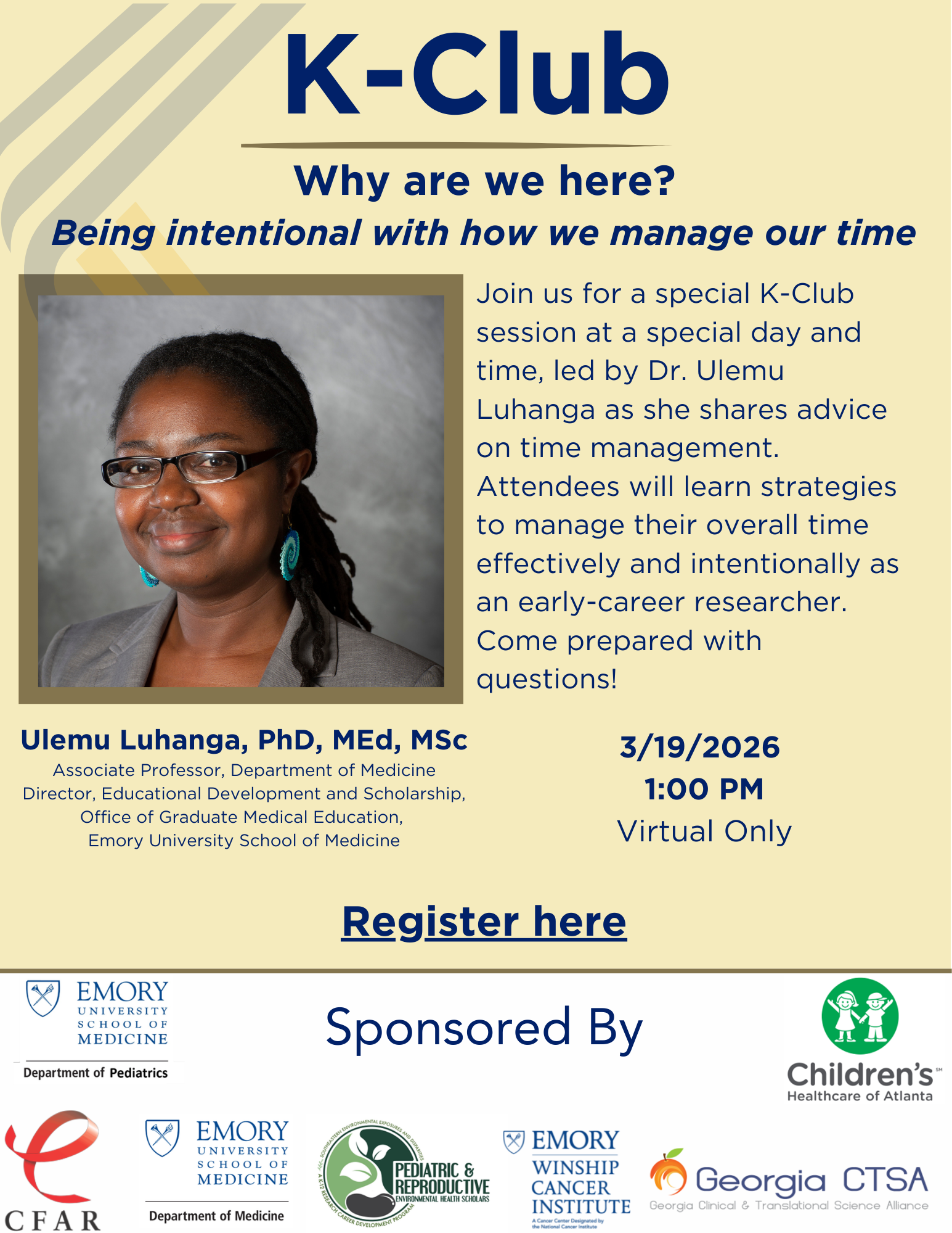 Join K-Club for a special virtual session at 1:00 PM featuring Ulemu Luhanga, PhD, Associate Professor, DOM, Emory SOM. Dr. Luhanga will share practical strategies to help early-career researchers manage their time more effectively and intentionally. Attendees will gain insights on prioritizing responsibilities and developing sustainable approaches to productivity in research careers. View Flyer.