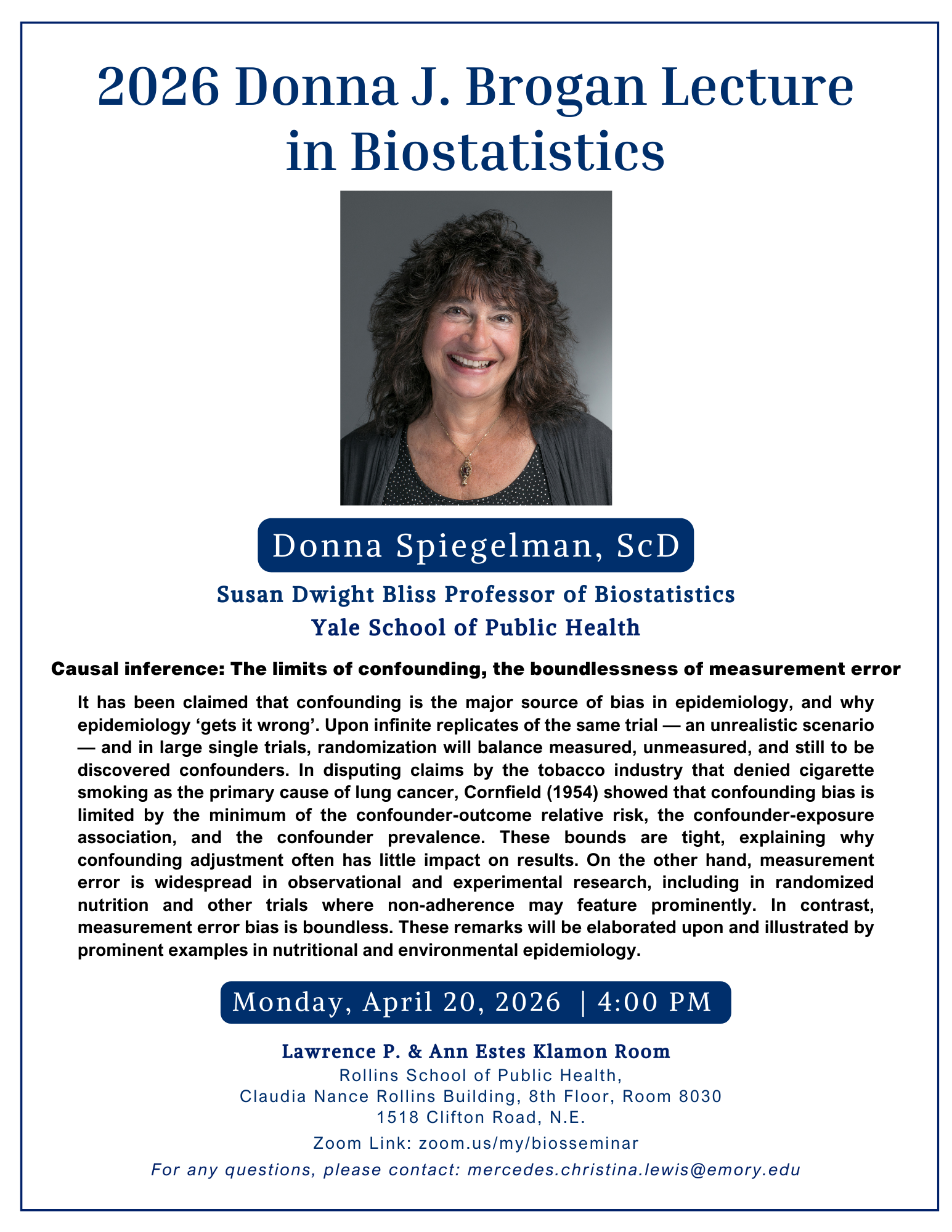 Join us from 2:00-4:00 PM at Emory’s Rollins School of Public Health, Claudia Nance Rollins Building, 8th floor, Klamon Room, or via Zoom. Donna Spiegelman, ScD, Yale, will present “Causal Inference: The Limits of Confounding, the Boundlessness of Measurement Error,” exploring key challenges and advancements in epidemiologic research methods. View Flyer.